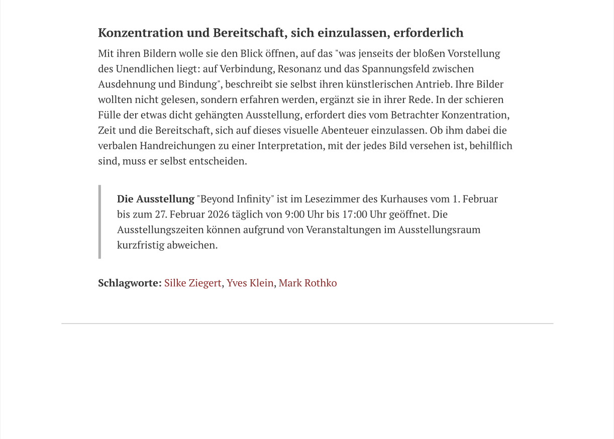 Bildschirmfoto 2026-02-05 um 19.23.33 Published 5. Februar 2026 at 1222 × 874 in Badische Zeitung: Bericht von Benedikt Sommer über „Beyond Infinity“ von Silke Ziegert (Februar 2026) ← Previous /
